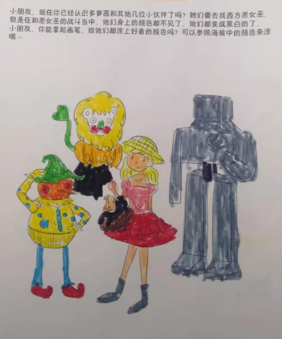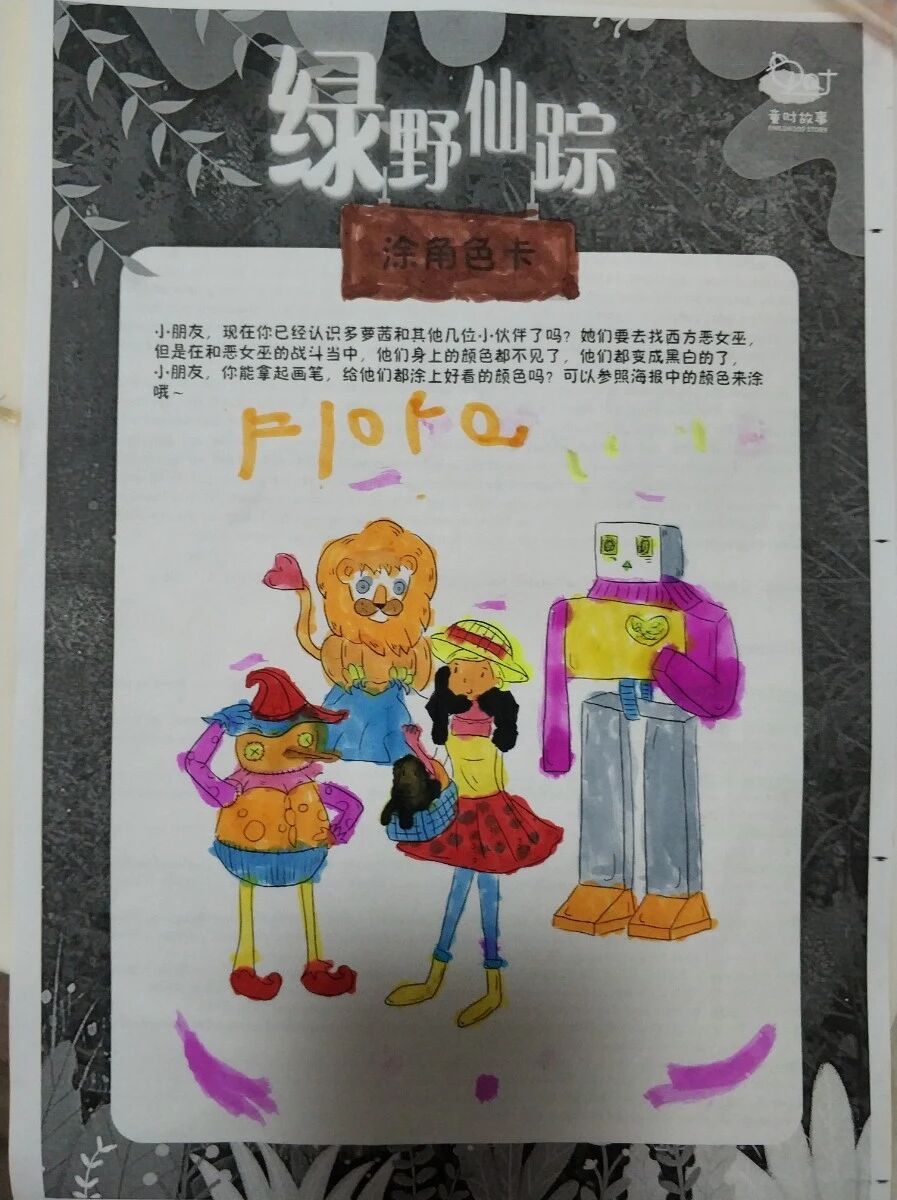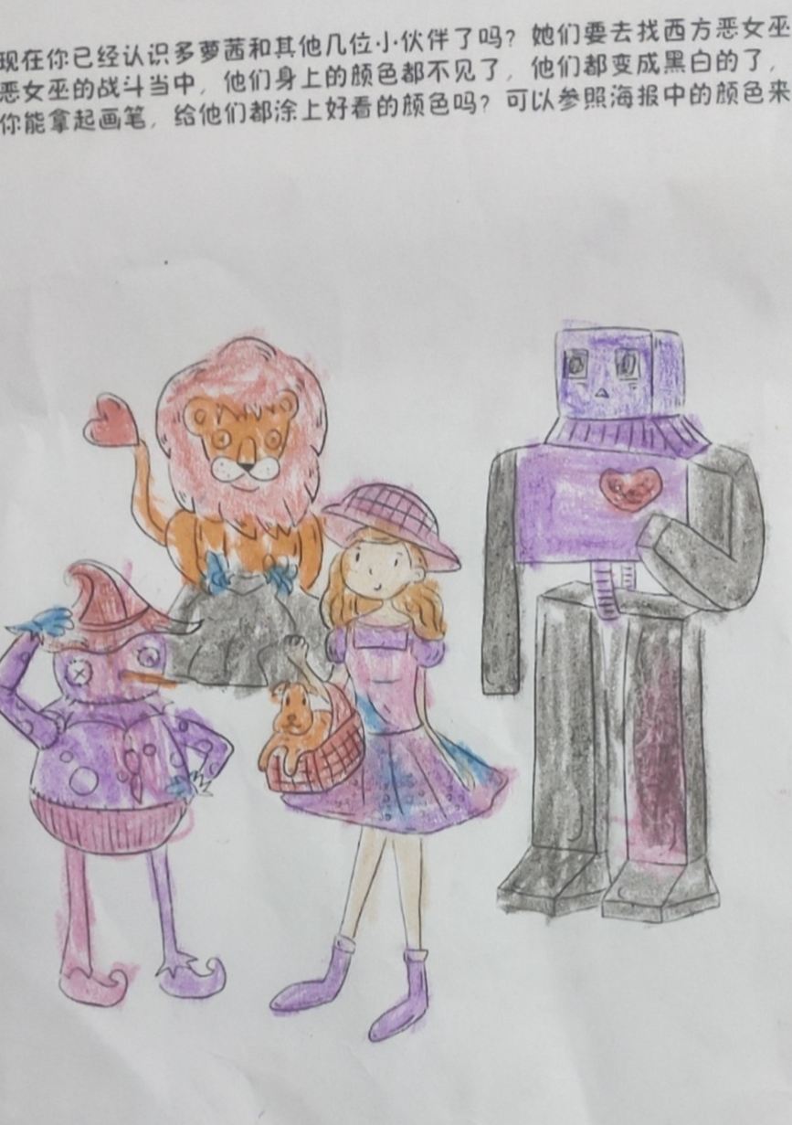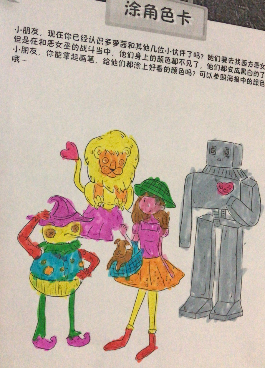 在孩子们的世界里,胆小狮长出了火红火红的头发,看起来真有百兽之王的样子;多萝茜可以徒手爬上城墙去干掉害人的恶女巫;稻草人即使被插在竹竿上也依然有嫩嫩的树叶围绕在他周围......