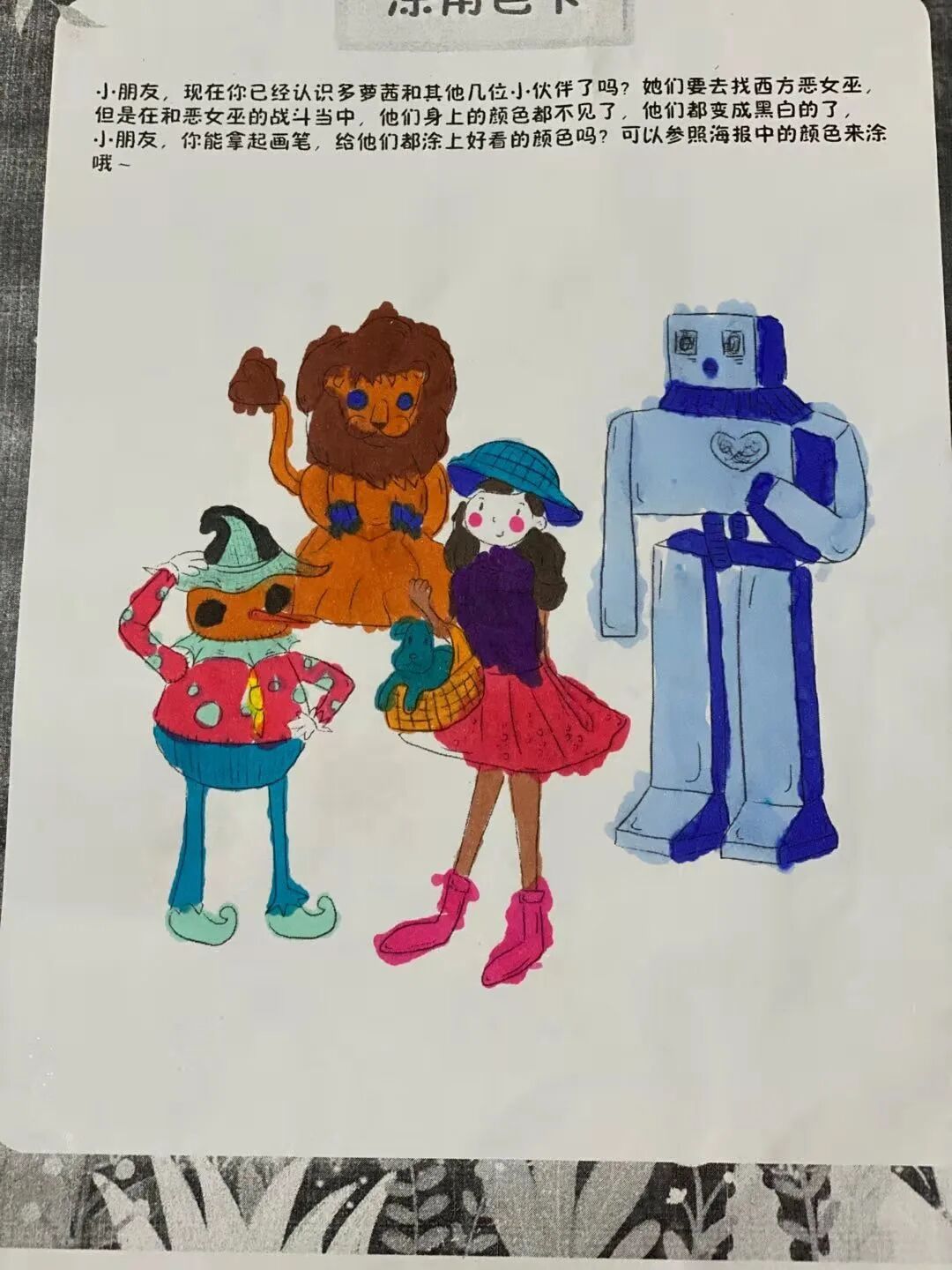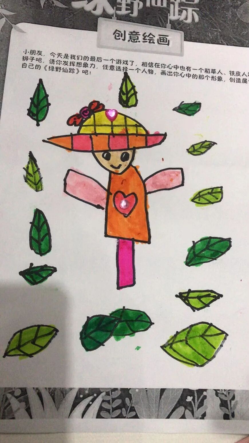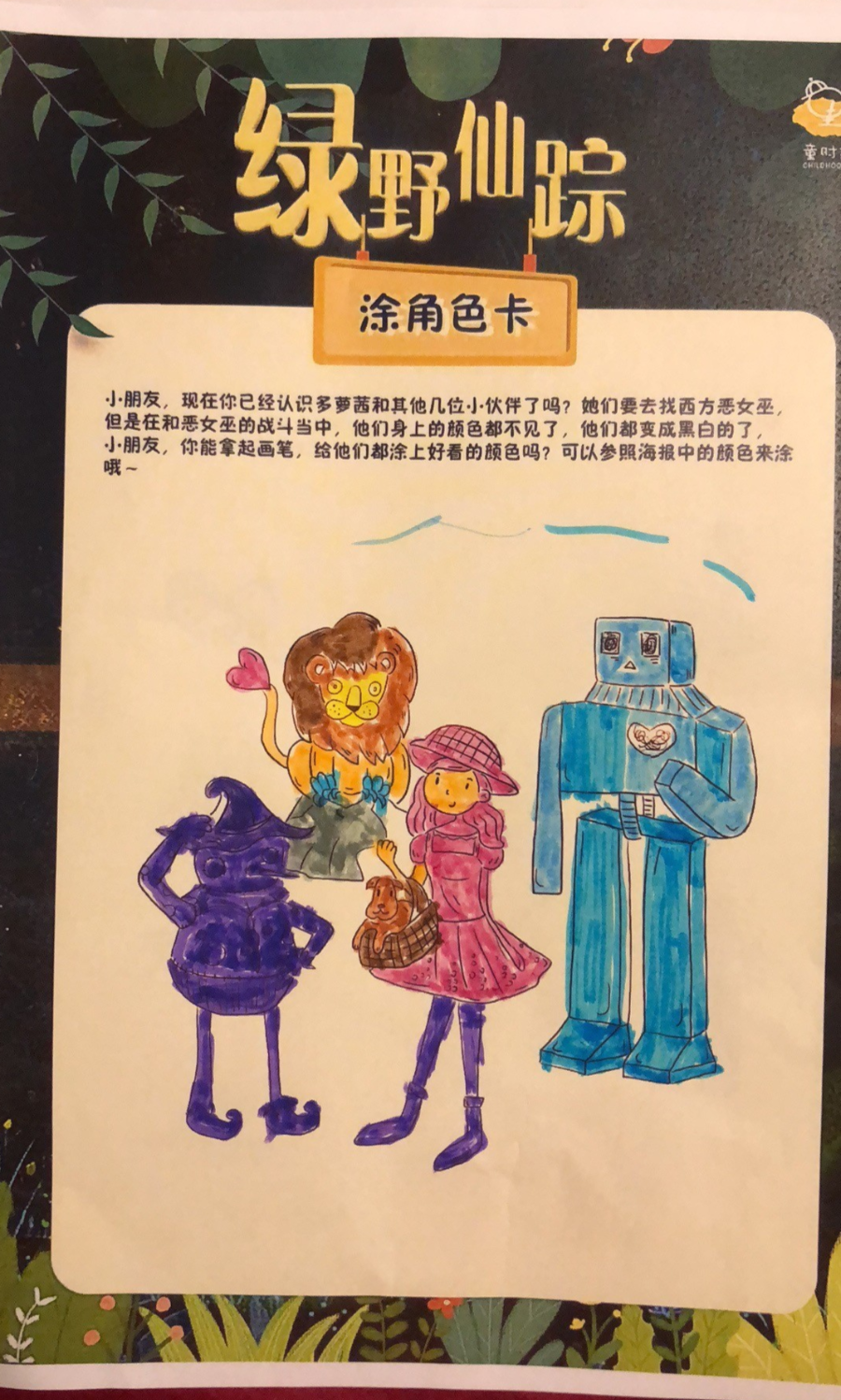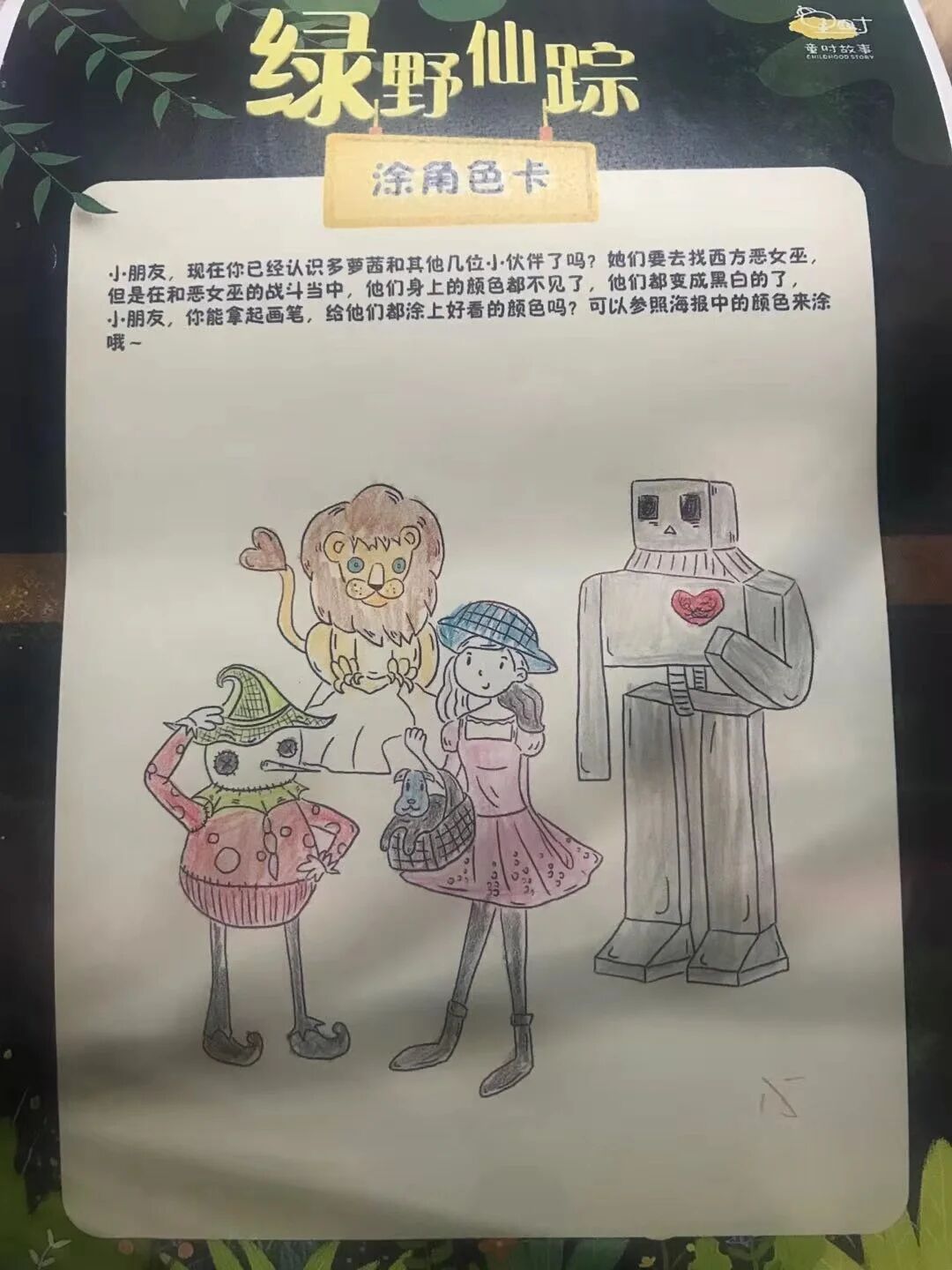 在孩子们的世界里,胆小狮长出了火红火红的头发,看起来真有百兽之王的样子;多萝茜可以徒手爬上城墙去干掉害人的恶女巫;稻草人即使被插在竹竿上也依然有嫩嫩的树叶围绕在他周围......