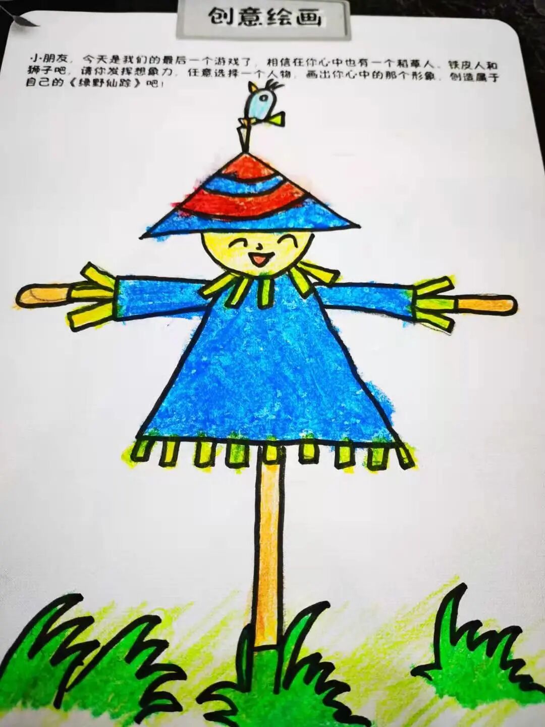 而且,还有一个小朋友因为觉得稻草人太孤单了,专门画了一只小鸟陪他。