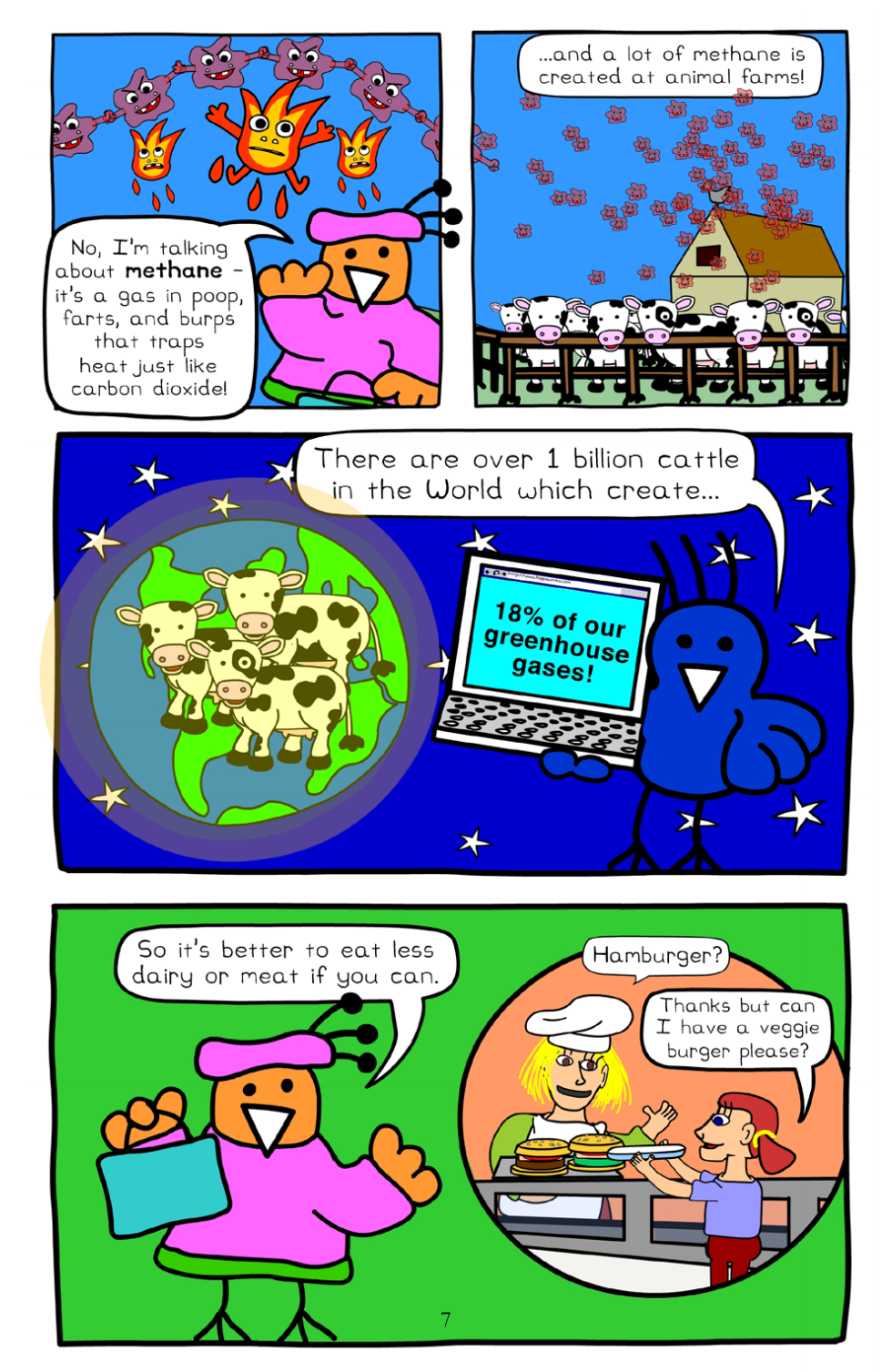 苏珊:不,我是在说甲烷,一种在大便、屁、打嗝的时候会产生的气体,它也会像二氧化碳一样阻止热量散发。动物农场会制造大量的甲烷。想想看,地球上有超过十亿的牛在制造甲烷......所以我们要尽可能少吃肉。