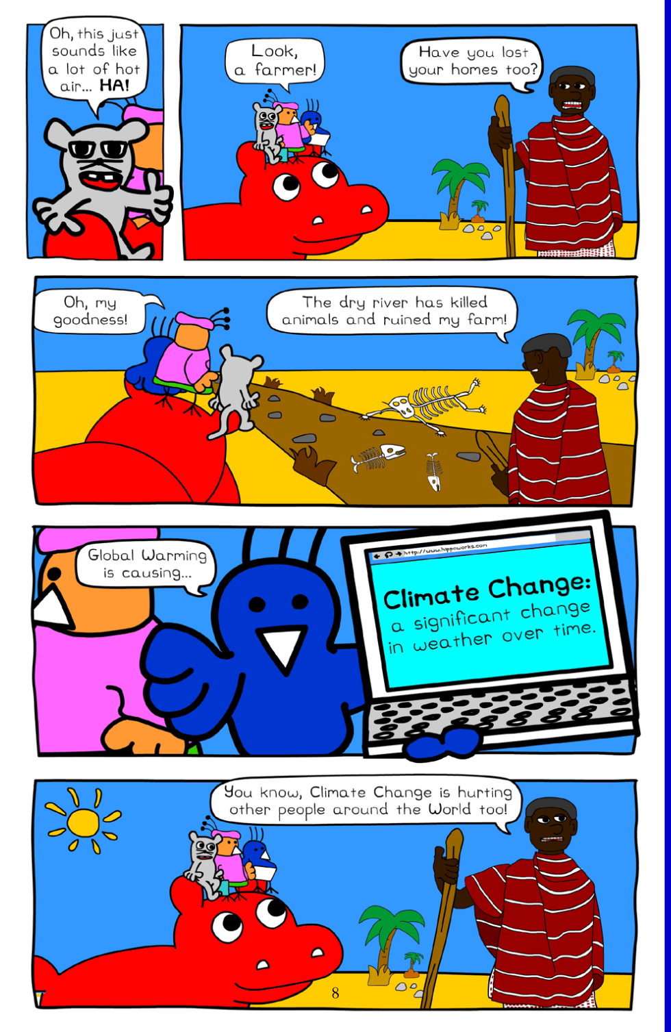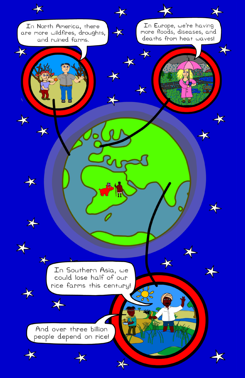 农夫:你要知道,气候变化也会伤害地球上的其他人。北美出现了更多的野火、干旱、被毁灭的农场;欧洲遭遇了更多的洪水、疾病,热浪造成了很多死亡;南亚一半的粮田会在本世纪消失,而三十亿的人口依赖大米。