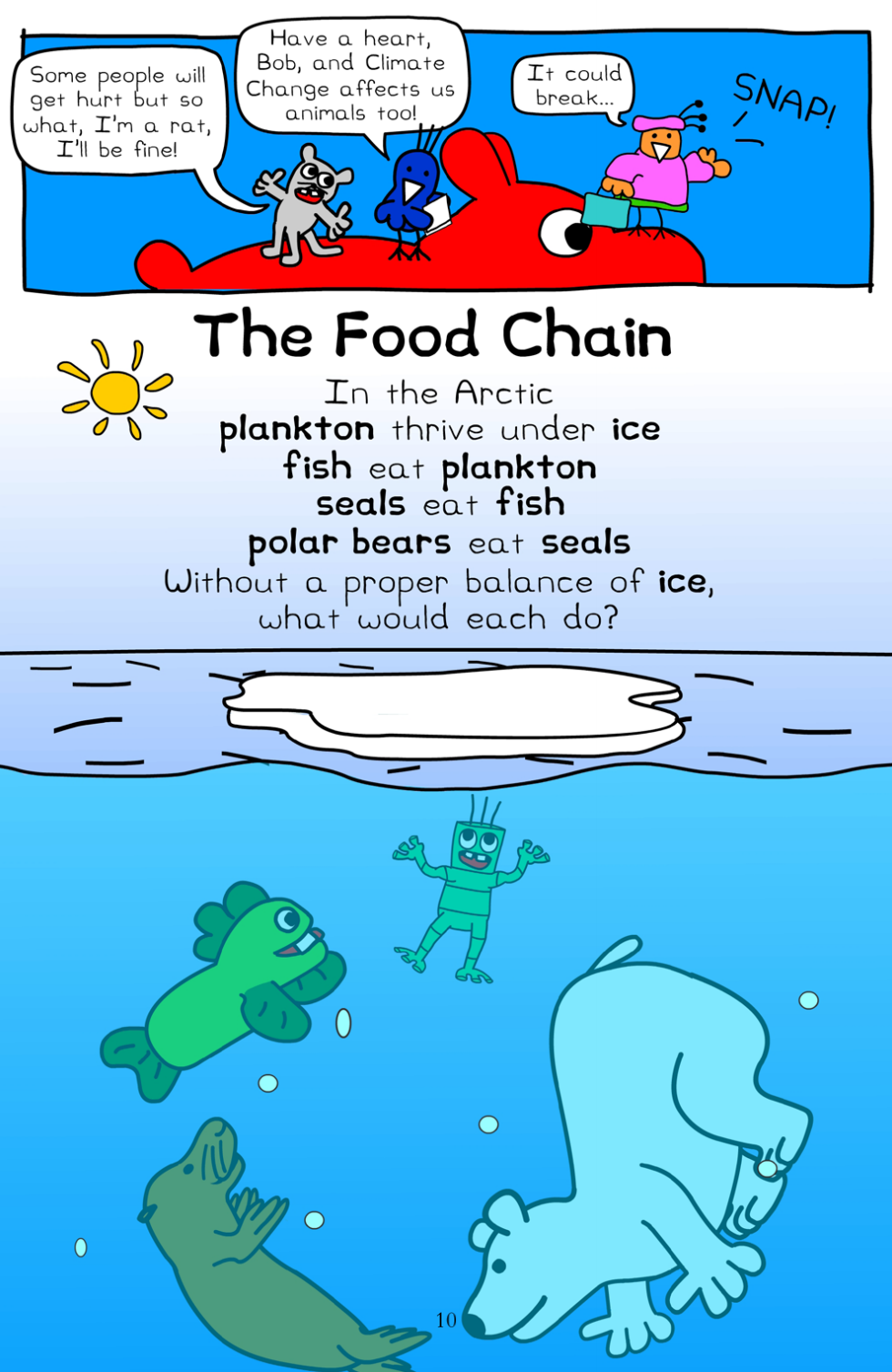 佩普:有点同理心吧鲍勃!气候变化也会给动物带来影响,比如破坏食物链。在北极,冰下浮游生物大量繁殖。鱼吃浮游生物,海豹吃鱼,北极熊吃海豹。如果没有冰的平衡,它们会怎样?