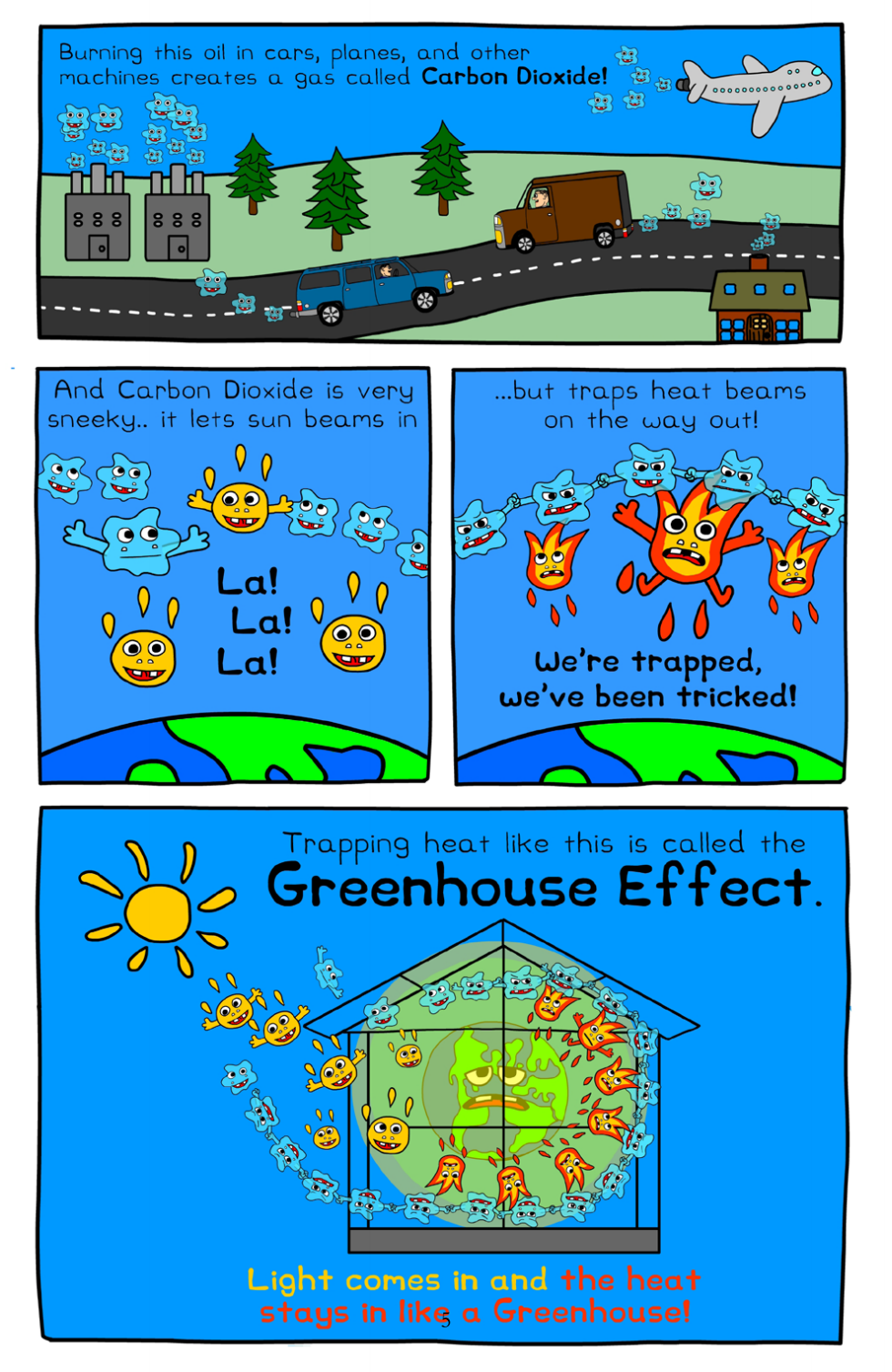 数百万年前,动植物死后的遗骸变成了我们从地底开采的石油。汽车、飞机和其他机器燃烧石油制造出二氧化碳。二氧化碳非常狡猾,它可以让阳光照射进来,但会阻止热量散发,形成温室效应。