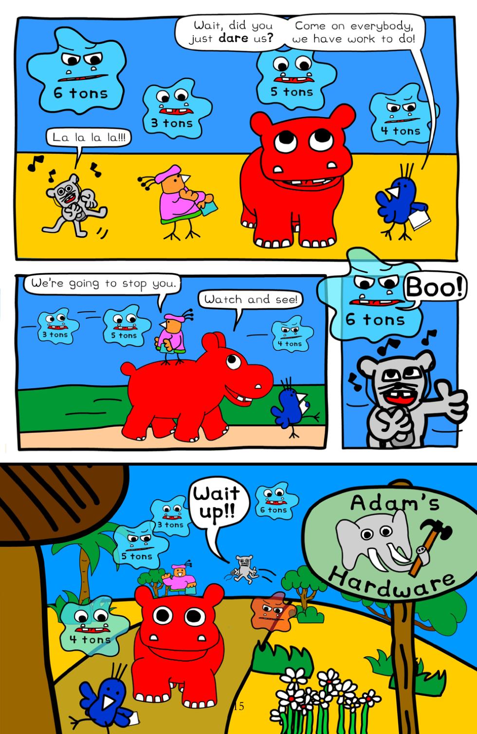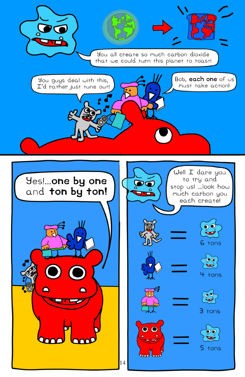 碳:我谅你们不敢阻止我们,看你们每个人都制造了多少碳!鲍勃六吨,佩普四吨,苏珊三吨,西蒙五吨。
