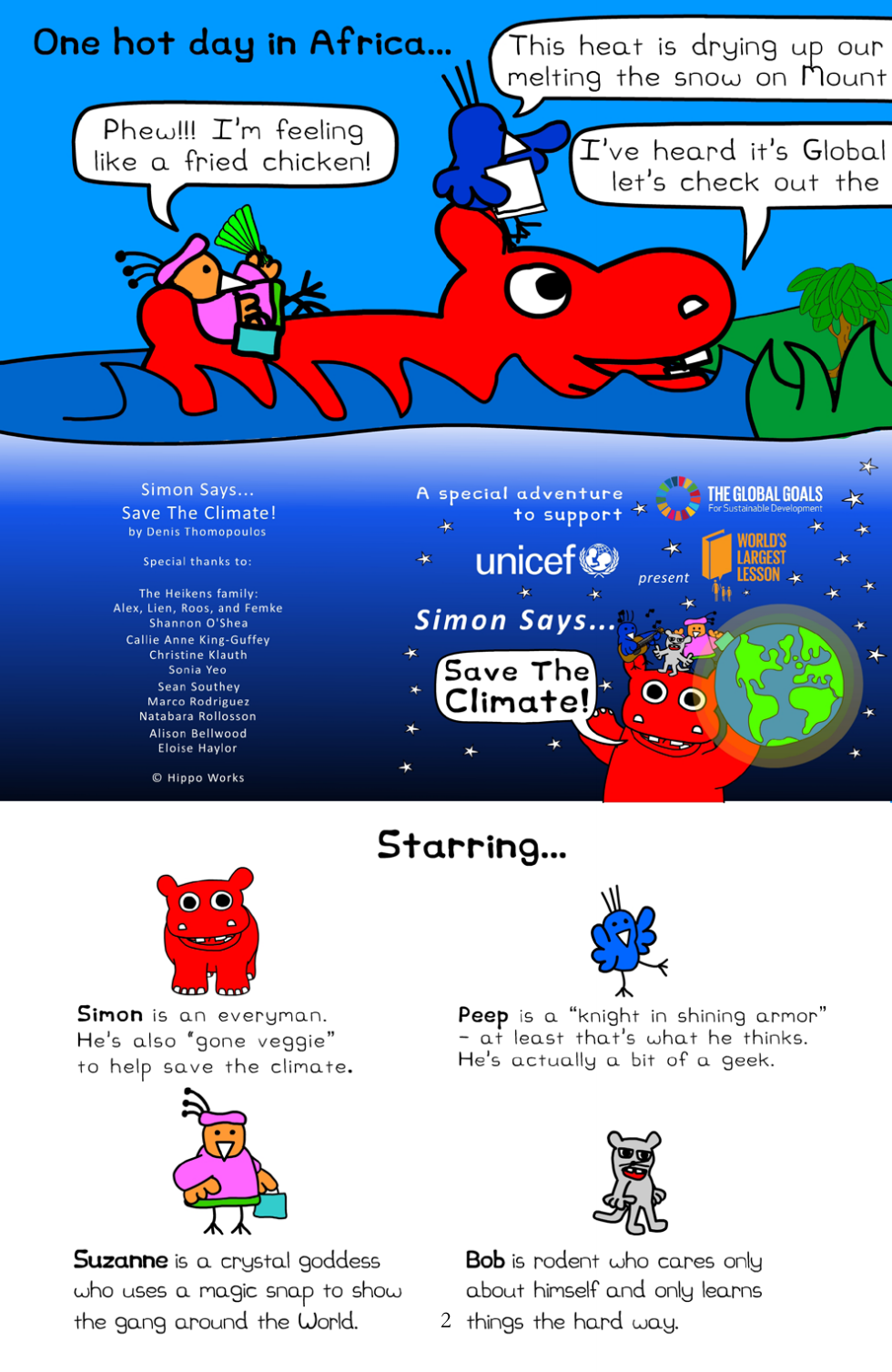 如何让孩子从小理解气候变化,以及与人类的关系,并在日常生活中力所能及地参与相关活动?今天,我们向大家推荐一本由联合国和艺术家丹尼斯·托莫普洛斯(Denis Thomopoulos)一起打造的漫画《西蒙说:气候行动》,看看主人公河马西蒙和他的朋友小鸟佩普(Peep)、小鸡苏珊(Suzanne)、老鼠鲍勃(Bob)是如何保护环境的?