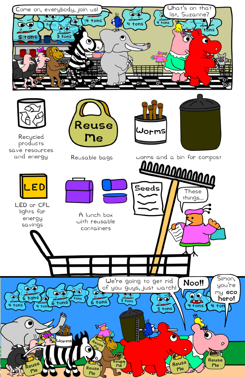 苏珊:节约资源和能源的再循环商品、再利用袋子、蚯蚓和堆肥箱、节能型光源、可重复使用的午餐盒。