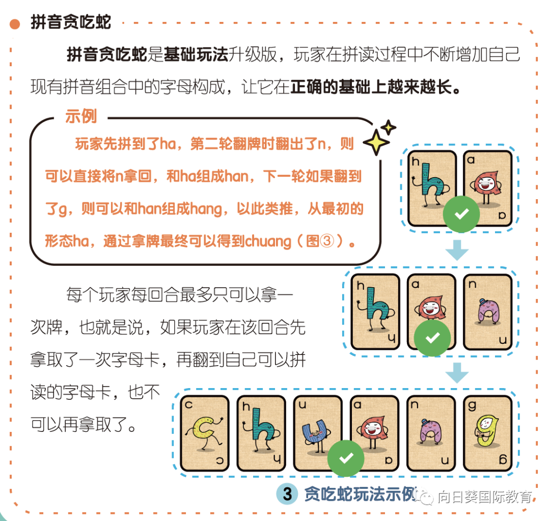 在拼音基础玩法中,孩子直接可以拿走的“gan gao nao na ao”中的任何一个,但是在拼音贪吃蛇中,孩子能直接放进自己卡牌堆里的只有gao 。