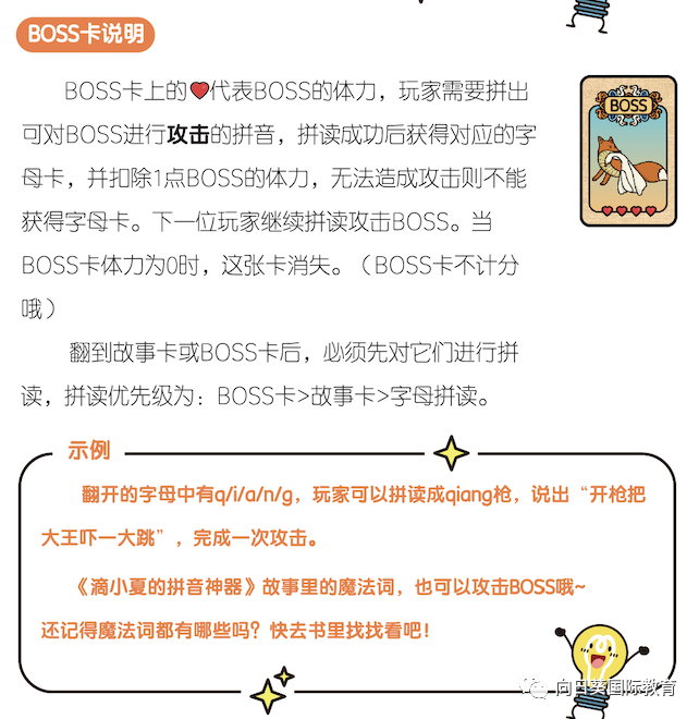 第一是“邪恶的”BOSS卡。孩子们需要在拼读的基础上,充分发挥自己的想象力去组词,攻击并打败BOSS才能获得胜利。