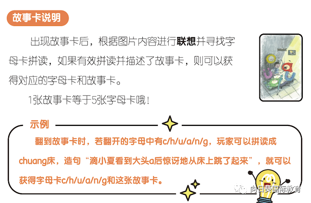 第二是故事卡。这个设计锻炼的是孩子看图说话的能力,需要孩子开动脑筋让一个发音变成词,一个词变成跟故事卡上有关的句子。如此锻炼下来,不光孩子的拼音水平会进步,也为今后的写作打下基础。