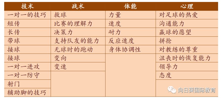 教练主要从以下四大方面、30个小项进行评估,每个小项的满分为10分: